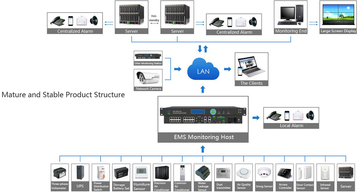 Generally, the intelligent duty-keeping system is deployed in the provincial monitoring center.The provincial, municipal, district and county data are aggregated to the provincial monitoring center through the secondary network.Thereby the monitoring of the province's archive storehouse environment is realized. The professional monitoring personnel are arranged in the provincial monitoring center.The storehouse environment is monitored in real time through auxiliary alarm means such as SMS, telephone, voice, sound and light, etc..Theweekly, monthly and annual operation and maintenance report of the storehouse is submitted according to the requirements.